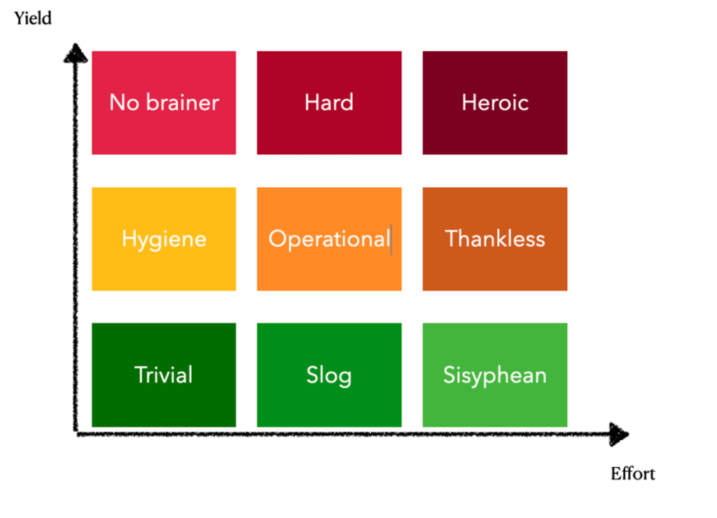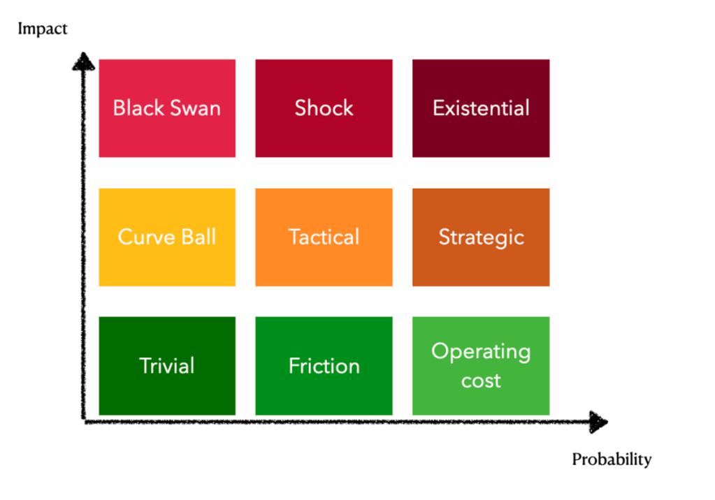 - Critical risk organized after no brainers, hygiene, trivial, operational, hard and with a possible addition of the heroic — but only after the first categories have been addressed.
